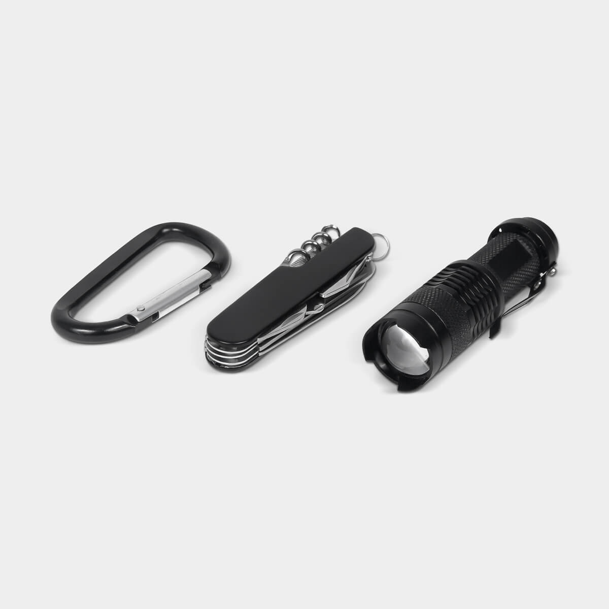 Set de herramientas multiusos. Incluye gancho metálico, lámpara con luz ajustable y navaja con 9 funciones: (navaja, sierra, tijeras, destapador, abrelatas, sacacorchos, guía de hilo, lima y desarmador de cruz). Incluye caja individual.